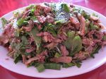 Essentially it is a mix of ground meat (chicken, beef or pork) with chilli, lime juice, mint and fish sauce. There are most likely variations on this recipe but this is how we make it.